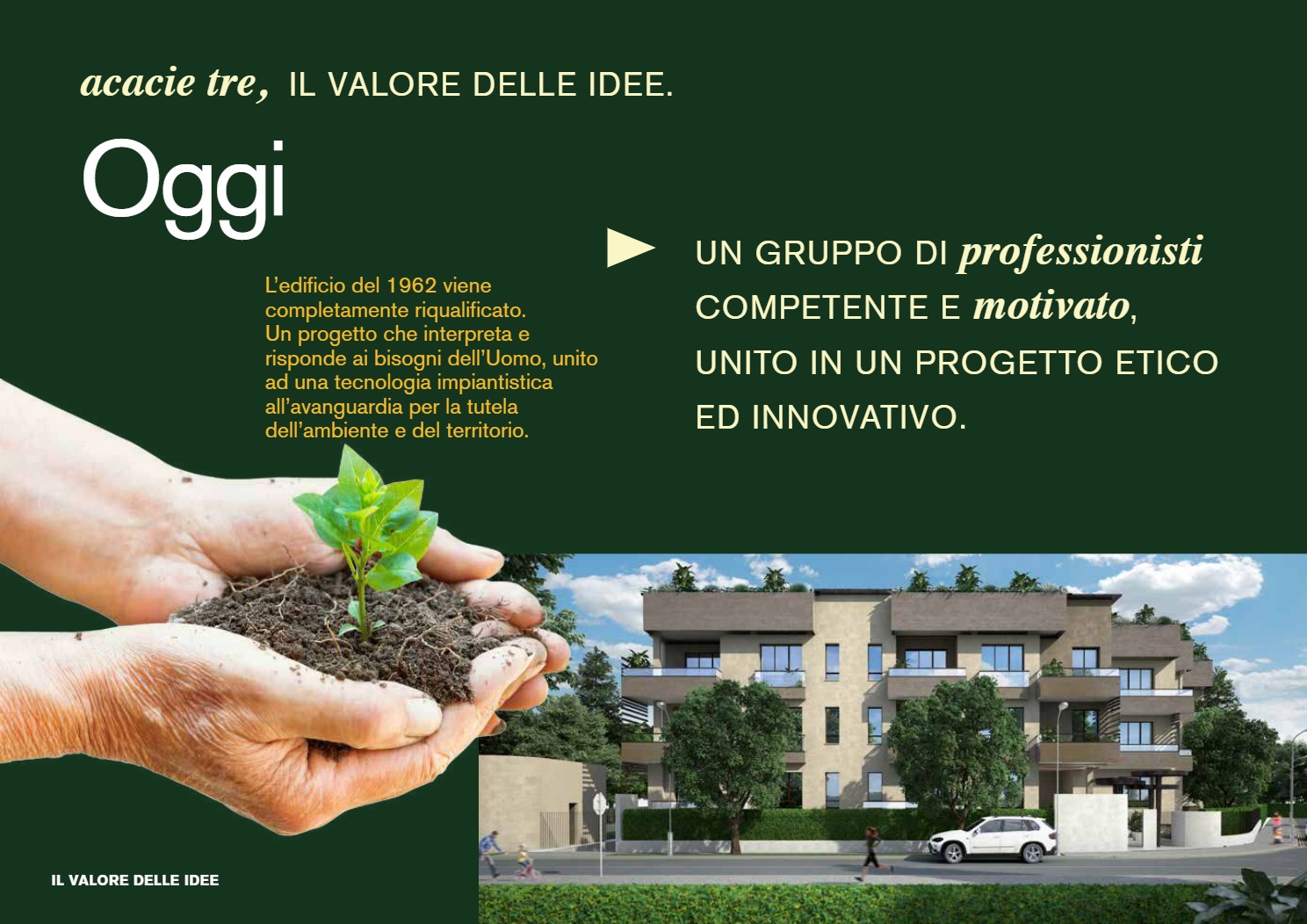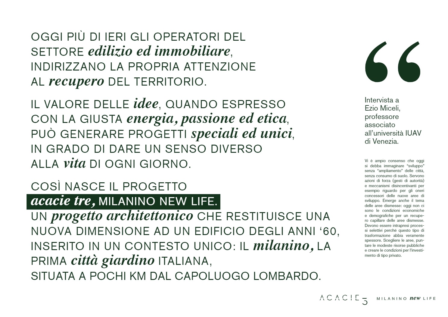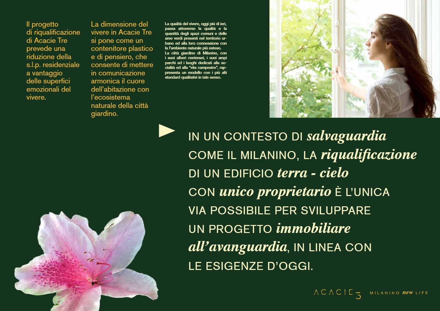 Sono questi i princìpi alla base di ACACIE 3, Milanino New Life, un esempio concreto di sviluppo immobiliare che ha restituito alla comunità di Cusano Milanino un prodotto di valore e qualità, in posizione unica e privilegiata, direttamente dal proprietario all’utilizzatore finale. Un progetto che abbiamo pensato, partendo dallo studio del brand e della comunicazione, sviluppato e commercializzato.