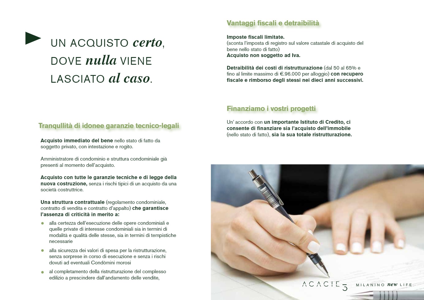 L’acquisto immediato del bene nello stato di fatto da soggetto privato, le garanzie tecniche e di legge, la struttura contrattuale (regolamento condominiale, contratto di vendita e contratto d’appalto), l’assistenza fiscale e il finanziamento sull’acquisto hanno consentito ai Clienti di godere di tutte le agevolazioni fiscali derivanti dalla imponente mole di lavori di riqualificazione generale dell’immobile con l’utilizzo di energie rinnovabili.