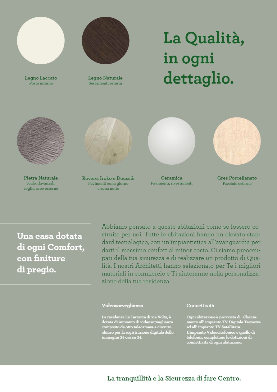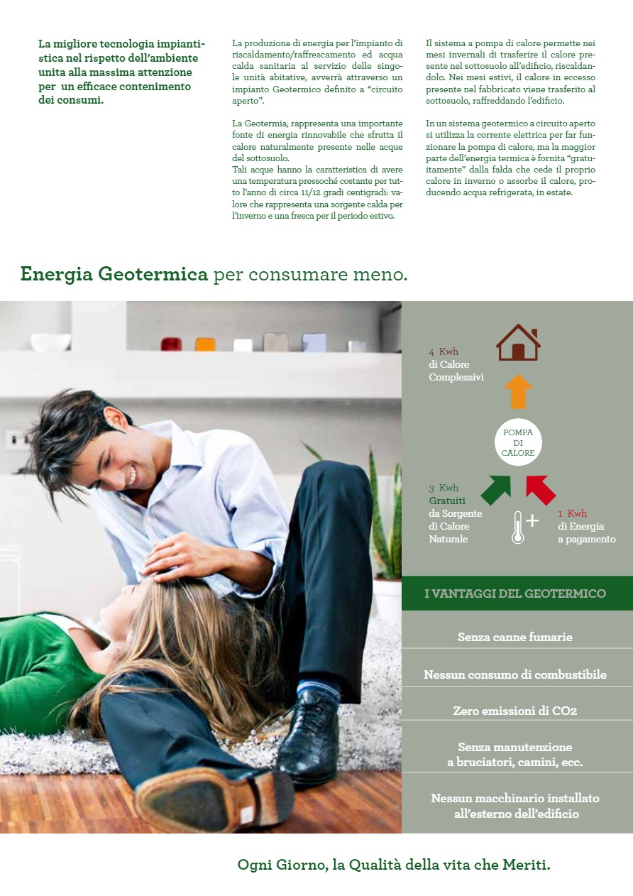 La scelta dei materiali e la tecnologia impiantistica utilizzata, hanno permesso a queste abitazioni di attestarsi in classe energetica A, nel pieno rispetto dell’ambiente e con un efficace contenimento dei consumi.