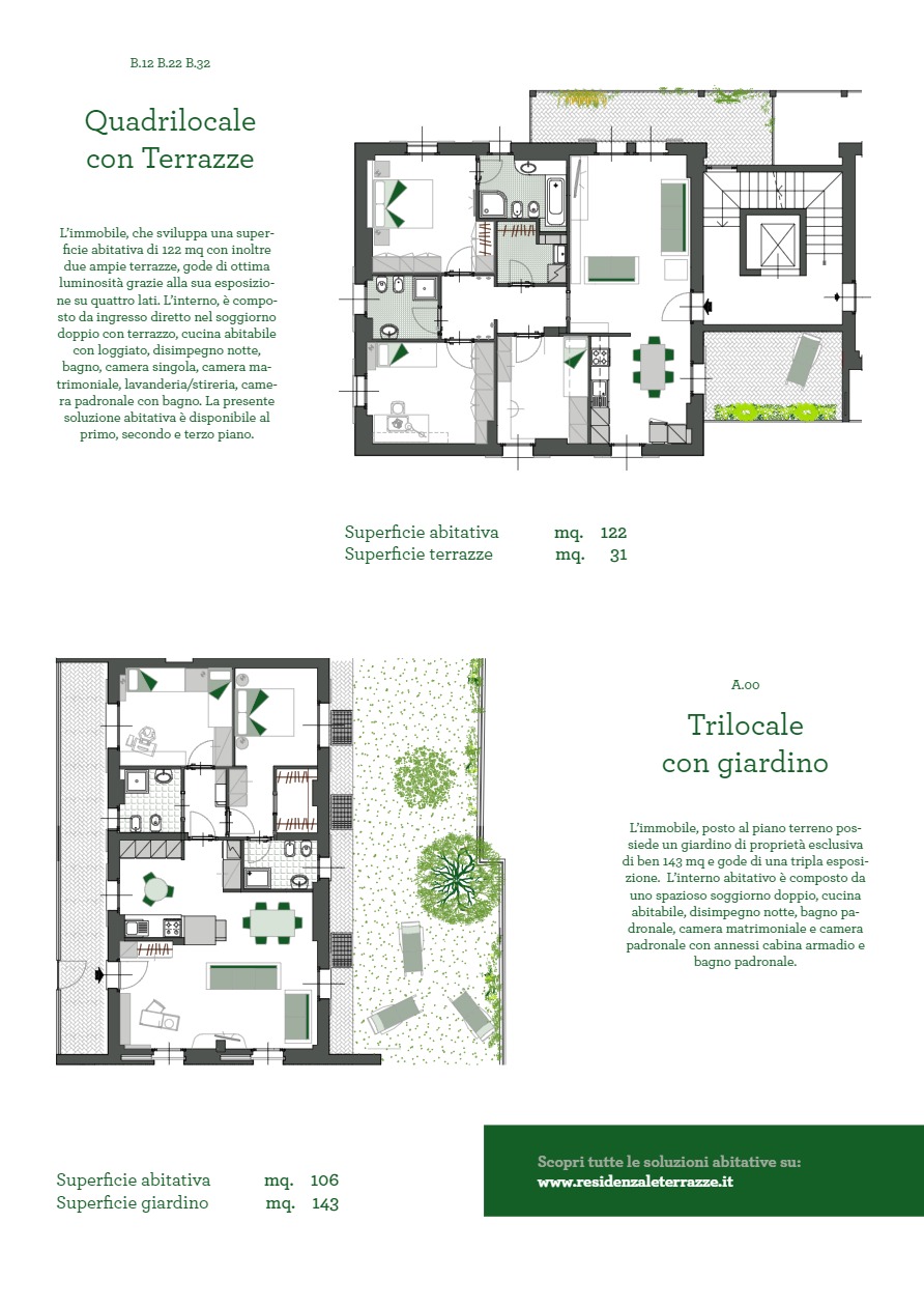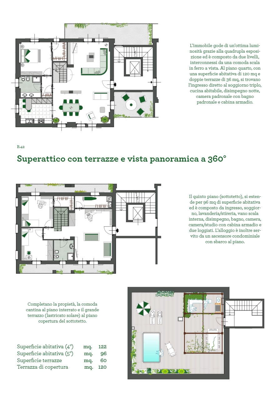 La palazzina è costituita da bilocali, trilocali e quadrilocali con terrazza o giardino, oltre ad uno splendido superattivo con terrazze e vista panoramica a 360°.